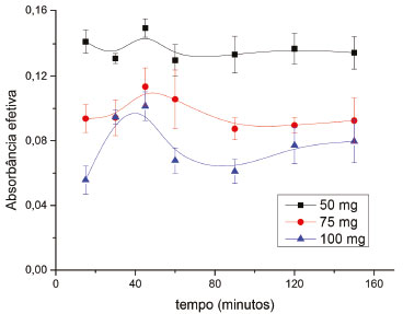 RESULTADOS E DISCUSSÃO Informações preliminares A abordagem escolhida para quantificar Fe total pela técnica de análise de imagens digitais necessita da formação de um complexo colorido, e que este complexo possua a capacidade de ser sorvido sobre uma fase sólida, para posteriormente ter sua imagem registrada. O reagente cromogênio 8-hidroxiquinolina (8HQ) foi escolhido pelo fato de apresentar capacidade de complexar com os íons Fe III (Log β = 36,9) muito superior a outros metais.61-67 A fase sólida selecionada foi espuma de poliuretano (EPU), dada sua grande capacidade sortiva para espécies hidrofóbicas.68,69 O complexo formado entre Fe III e 8HQ apresentou coloração marrom quando sorvido sobre a EPU, e estudos preliminares mostraram uma que a intensidade de coloração aumentava proporcionalmente com o aumento da concentração, sem variações ao longo do tempo (durante 3 horas). A literatura61 aponta que a estequiometria dessa reação é de 1 para 3, de forma que ocorre em solução: ![]() Assim, de modo a alcançar-se máxima sensibilidade, no presente trabalho foram estudadas e otimizadas as condições de formação do complexo Fe(III)-8HQ e sua sorção em EPU, em termos dos parâmetros concentração do ligante, pH e força iônica do meio, tempo de agitação e massa de fase sólida. Para todos os experimentos a velocidade de agitação foi fixada em 100 rpm, velocidade máxima oferecida pelo aparato utilizado. Vale ressaltar que o preparo das amostras, envolvendo a dissolução em solução concentrada de HNO3, ocasiona a conversão de íons Fe (II) possivelmente presentes em Fe (III) como descrito na seguinte equação.70,71 É justamente essa etapa que garante que o método seja para ferro total e não Fe(III). ![]() Efeito do tempo de agitação e massa de EPU As variáveis tempo de agitação e massa de EPU empregada foram avaliadas simultaneamente, a fim de averiguar se o aumento da massa afetaria a magnitude do sinal analítico. Nesse estudo, a massa de EPU foi estudada em 50, 75 e 100 mg, enquanto o tempo de agitação entre 15 e 150 minutos, com concentração de ferro fixada em 6,00 µmol L-1, 10,0 mmol L-1 8HQ e 8,00 mmol L-1 BR pH 6,0. Avaliando-se os resultados obtidos neste experimento, mostrados na Figura 2, foi observado que um aumento da massa ocasionou diminuição na intensidade do sinal analítico, uma vez que quanto maior a dispersão do complexo no meio sorvente, menor o sinal alcançado. Para a menor massa estudada (50 mg), o sinal de absorbância é mais elevado, já que a mesma quantidade de complexo é retida numa área superficial menor, fato também observado em outros trabalhos da literatura que envolvem retenção de complexos em fases sólidos com quantificação por DIA.25,26,51