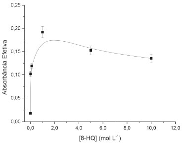 Quanto ao tempo de agitação, não foi observada significativa influência deste sobre o sinal analítico. Assim, com o intuito de garantir máxima sensibilidade às determinações, foi selecionada a massa de 50 mg de EPU e tempo de agitação de 45 minutos. Efeito da concentração de 8HQ O estudo da concentração de 8HQ sobre o sistema foi avaliado no intervalo de 1,00 x 10-3 mmol L-1 a 10 mmol L-1, com concentração de ferro fixada em 6,00 µmol L-1. O resultado desse estudo é apresentado na Figura 3.