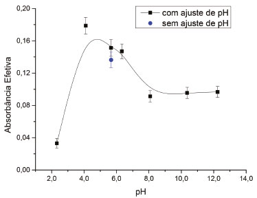 Maiores concentrações do ligante aumentam inicialmente a concentração de complexo gerado e retido na EPU, tornando mais intenso o sinal de absorbância. Observa-se, contudo, um decréscimo do sinal nas concentrações mais elevadas de 8HQ. Isso ocorre possivelmente por conta da retenção de fração do ligante livre sobre a EPU em elevadas concentrações deste, provocando diminuição do sinal analítico. Assim sendo, selecionou-se a concentração de 1,00 mmol L-1 de 8HQ para ser empregada nos experimentos subsequentes. Tal concentração oferece sinal satisfatório dispensando o uso de quantidades excessivas do ligante. Efeito do pH do meio reacional O pH do meio foi também considerado um fator importante a ser avaliado tendo em vista que tanto ferro quanto o ligante podem se apresentar como diferentes espécies graças às suas características ácido/básicas. O pH das soluções foi ajustado utilizando-se o tampão Britton Robinson, composto pelos sistemas acetato, fosfato e borato, cada um em concentração de 8,00 mmol L-1, e variado entre pH 2,34 e 12,4, fixadas as concentrações de ferro em 6,00 µmol L-1 e de 8HQ em 1,00 mmol L-1. Adicionalmente, uma solução contendo ferro e 8HQ nessas concentrações, sem ajuste de pH, foi avaliada. O resultado desse estudo é apresentado na Figura 4.