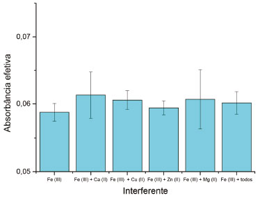 Pode-se observar um aumento no sinal analítico entre pH 2 e 5, uma queda até pH 8, e um platô a partir de então. Esse comportamento pode ser explicado em função do equilíbrio ácido base do sistema, envolvendo a carga superficial do sorvente (EPU), a formação do complexo e de hidróxidos de ferro. Em meio excessivamente ácido (pH inferior a 2,0), a superfície do sólido encontra-se protonada,69 e essa carga positiva torna desfavorável à sorção do complexo. A medida que o pH aumenta, diminui a carga superficial do sólido até sua neutralização, ao mesmo tempo que aumenta a tendência de formação do complexo, visto que 8HQ apresenta pKa 6,50± 0,20.72 Em pH superior a 6,0 o processo de sorção do complexo sobre a EPU é prejudicado pelo fato da espécie Fe III não ser predominante no meio reacional. Nesse intervalo mais alcalino, há formação de hidróxidos de ferro, que tornam este metal indisponível para a complexação com 8HQ, resultando em queda do sinal analítico.62,73-75 Sinais analíticos mais intensos foram alcançados em pH 4,01. Pelos resultados expostos na Figura 4 é possível notar que em pH 5,7, obtido seja com tamponamento ou não (solução sem ajuste de pH), a intensidade do sinal alcançado é a mesma, o que leva a crer que apenas o pH interfere no sinal analítico, e não a força iônica do meio reacional, no intervalo avaliado. Efeito da força iônica do meio reacional A fim de confirmar a hipótese levantada anteriormente e avaliar se a ausência de influência da força iônica era ou não limitada ao intervalo de concentração do tampão estudado (8,00 mmol L-1), foi realizado um estudo mantendo-se constante o pH e variando-se a força iônica do meio. Espumas contendo a mesma concentração de complexo Fe(III)-8HQ foram avaliadas sob diferentes ajustes de força iônica por adição de KNO3, cuja concentração foi variada entre 0 e 2,0 mol L-1, fixadas as concentrações de ferro em 6,00 µmol L-1, de 8HQ em 1,00 mmol L-1 e de tampão BR em 8,00 mmol L-1 e pH 4,0. Após avaliar as imagens digitais geradas, a baixa variabilidade dos dados de absorbância obtidos comprovou que a força iônica é um parâmetro pouco significativo à intensidade do sinal analítico. Avaliação de possíveis interferências Como mencionado anteriormente, as espécies consideradas como possíveis interferentes ao método foram selecionadas tendo em vista a composição esperada segundo as informações fornecidas pelos rótulos das amostras de suplementos alimentares (sais de cálcio, cobre II, magnésio e zinco). As concentrações das espécies presentes nas soluções analisadas neste estudo foram mencionadas no item 2.4. A Figura 5 mostra a variação do sinal de absorbância do complexo Fe(III)-8HQ mediante a adição destes íons.