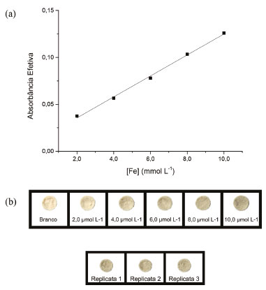A comparação dos coeficientes angulares foi feita por meio do teste t-Student, utilizando-se as médias das inclinações obtidas para três curvas analíticas e três curvas de adição de analito referentes a cada amostra. Antes da aplicação do teste de comparação entre médias, um teste F para comparação entre as variâncias foi realizado a fim de verificar se havia diferença estatística entre elas. Para todas as amostras avaliadas, Fcalculado < Fcrítico no nível de confiança de 95%, o que permite concluir que não há diferença estatística entre a precisão das médias em cada caso. Portanto, é possível aplicar o teste t-Student de comparação entre médias utilizando-se a variância agrupada. A hipótese nula é mantida para estas amostras no nível de confiança de 95%, pois Tcalculado < Tcrítico.60 Assim, é possível afirmar que os concomitantes presentes na matriz estudada não causam interferência ao método. Validação e parâmetros analíticos de mérito do método Os parâmetros analíticos de mérito foram obtidos nas condições otimizadas, descritas anteriormente. Nessas condições, uma curva analítica típica apresenta a equação Abs = 0,0112 [Fe, µmol L-1] + 0,0132 com r2 = 0,9975. Para comprovar a linearidade, foi feita uma ANOVA. O teste mostrou que a linearidade foi significativa enquanto a falta de ajuste foi não significativa. A curva analítica está representada na Figura 6A, e as imagens utilizadas para construí-la na Figura 6B. A região de interesse (ROI) usada para captar o sinal constituía de uma fração da imagem, diferentes circunferências, desde que menor que o raio da figura, não influenciavam no sinal. Como descrito no item 2.4, foram calculados os limites de detecção (0,53 µmol L-1) e de quantificação (1,78 µmol L-1). A precisão do método foi de 8,45%, enquanto que a exatidão apresentou o valor de 97,5 + 4,8%, parâmetros esses calculados segundo o que foi proposto no item 2.4.