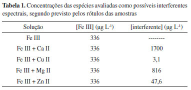 Nota-se que os desvios para as soluções contendo o analito e cada metal individualmente, bem como para a solução contendo todos os metais e o analito são inferiores a 5% do sinal do ferro isoladamente, indicando que as espécies estudadas não interferem no sinal analítico nas concentrações esperadas nas amostras. Embora todos os metais avaliados tenham a capacidade de formar complexos com a 8HQ, a constante de formação global do complexo Fe(III)-8HQ é significativamente maior que dos demais complexos com este ligante.62,72 Para avaliar a influência de interferências não aditivas ao método proposto, previamente à sua aplicação nas amostras estudadas, foram comparados os coeficientes angulares obtidos pela técnica de calibração externa com a obtida pela técnica de adição padrão, (construídas conforme relatado no item 2.4). O resultado desse estudo é apresentado na Tabela 2.