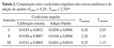 Para avaliar a ocorrência de interferências não aditivas, comparações entre coeficientes angulares de curvas analíticas e de adição de analito geradas com as amostras estudadas neste trabalho (construídas conforme relatado no item 2.3) foram realizadas. Tais dados foram gerados em triplicatas.