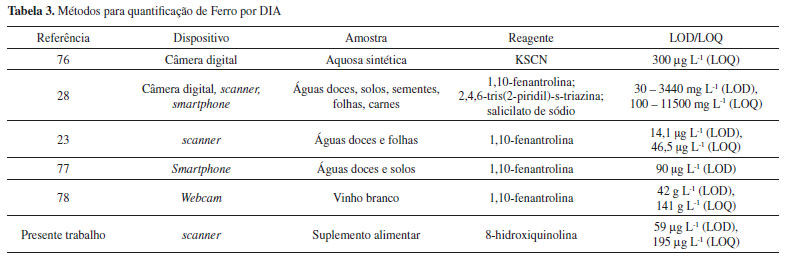 REFERÊNCIAS 1. Lieu, P. T.; Heiskala, M.; Peterson, P. A.; Yang, Y.; Mol. Aspects Med. 2001, 22, 1. 2. Abe-Matsumoto, L. T.; Sampaio, G. R.; Bastos, D. H. M.; Cad. Saude Publica 2015, 31, 1371. 3. Biesalski, H. K.; Tinz, J.; Nutrition 2017, 36, 60. 4. World Health Organization (WHO); The role of iron in human metabolic processes, 2011. 5. Niederau, C.; Fischer, R.; Purschel, A.; Stremmel, W.; Haussinger, D.; Gastroenterology 1996, 110, 1107. 6. Kassem, M. A.; Amin, A. S.; Food Chem. 2013, 141, 1941. 7. Fibigr, J.; Satínský, D.; Solich, P.; Anal. Chim. Acta 2018, 1036, 1. 8. Almendral, M. J.; Alonso, A.; Porras, M. J.; Garcı, M. A.; Curto, Y.; Microchim. Acta 2004, 147, 117. 9. Hasani, M.; Rezaei, A.; Abdollahi, H.; Spectrochim. Acta, Part A 2007, 68, 414. 10. Ruengsitagoon, W.; Talanta 2008, 74, 1236. 11. Cristina, M.; Quaresma, B.; Cassella, R. J.; De, M.; Santelli, R. E.; Talanta 2004, 62, 807. 12. Suzuki, T.; Sensui, M.; Anal. Chim. Acta 1991, 245, 43. 13. Niemelä, M.; Kola, H.; Eilola, K.; Perämäki, P.; J. Pharm. Biomed. Anal. 2004, 35, 433. 14. da Silva, J. E.; da Silva, F. A.; Pimentel, M. F.; Saldanha, R.; Lins, V.; Montenegro, B. S. M.; Ara, A. N.; Conceic, M.; Talanta 2006, 70, 522. 15. Braunschweig, J.; Bosch, J.; Heister, K.; Kuebeck, C.; Meckenstock, R. U.; J. Microbiol. Methods 2012, 89, 41. 16. Algeo, J. D.; Heine, D. R.; Phillips, H. A.; Hoek, F. B. G.; Schneider, M. R.; Freelin, J. M.; Denton, M. B.; Spectrochim. Acta 1985, 4, 1447. 17. Laglera, L. M.; Monticelli, D.; Environ. Electrochem. 2017, 3, 123. 18. Lin, M.; Pan, D.; Hu, X.; Han, H.; Li, F.; Sensors Actuators, B 2015, 219, 164. 19. Li, F.; Pan, D.; Lin, M.; Han, H.; Hu, X.; Kang, Q.; Electrochim. Acta 2015, 176, 548. 20. Wang, S.; Ouerdane, L.; Hoekenga, O.; Szpunar, J.; Lobinski, R.; Food Chem. 2019, 294, 414. 21. Merli, D.; Ravasio, F.; Protti, S.; Pesavento, M.; Profumo, A.; Talanta 2014, 130, 90. 22. Sorouraddin, M. H.; Saadati, M.; Mirabi, F.; J. Food Drug Anal. 2015, 23, 447. 23. Peng, B.; Chen, G.; Li, K.; Zhou, M.; Zhang, J.; Zhao, S.; Food Chem. 2017, 230, 667. 24. Vidal, M.; Garcia-Arrona, R.; Bordagaray, A.; Ostra, M.; Albizu, G.; Talanta 2018, 184, 58. 25. de Sá, I. C.; Feiteira, F. N.; Pacheco, W. F.; Food Anal. Methods 2020, 13, 962. 26. De O. Costa, G.; Feiteira, F. N.; De M. Schuenck, H.; Pacheco, W. F.; Anal. Methods 2018, 10, 4463. 27. Saraji, M.; Bagheri, N.; Sensors Actuators, B 2018, 270, 28. 28. Mohamed, A. A.; Shalaby, A. A.; Food Chem. 2019, 274, 360. 29. Curbani, L.; Gelinski, J. M. L. N.; Borges, E. M.; Food Anal. Methods 2020, 13, 249. 30. Pessoa, K. D.; Suarez, W. T.; dos Reis, M. F.; de Oliveira Krambeck Franco, M.; Moreira, R. P. L.; dos Santos, V. B.; Spectrochim. Acta, Part A 2017, 185, 310. 31. Tôrres, A. R.; Lyra, W. S.; Andrade, S. I. E.; Andrade, R. A. N.; Silva, E. C.; Araújo, M. C. U.; Gaião, E. N.; Talanta 2011, 84, 501. 32. Dai, X.; Xu, Y.; Zheng, J.; Ma, L.; Song, H.; Biosyst. Eng. 2020, 190, 157. 33. Sankar, K.; Lenisha, D.; Janaki, G.; Juliana, J.; Kumar, R. S.; Selvi, M. C.; Srinivasan, G.; Talanta 2020, 208, 120408. 34. Albizu, G.; Bordagaray, A.; Dávila, S.; Garcia-Arrona, R.; Ostra, M.; Vidal, M.; Microchem. J. 2020, 154, 104600. 35. Maleki, N.; Safavi, A.; Sedaghatpour, F.; Talanta 2004, 64, 830. 36. Zamora, L. L.; López, P. A.; Antón Fos, G. M.; Algarra, R. M.; Romero, A. M. M.; Calatayud, J. M.; Talanta 2011, 83, 1575. 37. Silva Lyra, W.; dos Santos, V. B.; Dionízio, A. G. G.; Martins, V. L.; Almeida, L. F.; Nóbrega Gaião, E.; Diniz, P. H. G. D.; Silva, E. C.; Araújo, M. C. U.; Talanta 2009, 77, 1584. 38. Chaplan, C. A.; Mitchell, H. T.; Martinez, A. W.; Anal. Methods 2014, 6, 1296. 39. Nitinaivinij, K.; Parnklang, T.; Thammacharoen, C.; Ekgasit, S.; Wongravee, K.; Anal. Methods 2014, 6, 9816. 40. Iqbal, Z.; Bjorklund, R. B.; Talanta 2011, 84, 1118. 41. Reile, C. G.; Rodríguez, M. S.; Fernandes, D. D. de S.; Gomes, A. de A.; Diniz, P. H. G. D.; Di Anibal, C. V.; Food Chem. 2020, 328, 127101. 42. Feiteira, F. N.; dos Reis, L. G. T.; Pacheco, W. F.; Cassella, R. J.; Microchem. J. 2015, 119, 44. 43. Catelani, T. A.; Bittar, D. B.; Pezza, L.; Pezza, H. R.; Talanta 2019, 196, 523. 44. Almeida, M. I. G. S.; Jayawardane, B. M.; Kolev, S. D.; McKelvie, I. D.; Talanta 2018, 177, 176. 45. Chanu, O. R.; Kapoor, A.; Karthik, V.; Mater. Today Proc. 2020, 0. 46. Luiz, V. H. M.; Lima, L. S.; Rossini, E. L.; Pezza, L.; Pezza, H. R.; Microchem. J. 2019, 147, 43. 47. Jia, B.; Wang, W.; Ni, X.; Lawrence, K. C.; Zhuang, H.; Yoon, S. C.; Gao, Z.; Chemom. Intell. Lab. Syst. 2020, 198, 103936. 48. Baiano, A.; J. Food Eng. 2017, 214, 10. 49. Capitan-Vallvey, L. F.; Nuria, L.; Martínez-olmos, A.; Erenas, M. M.; Palma, A. J.; Anal. Chim. Acta 2015, 899, 23. 50. Nuria Lopez-Ruiz, V. F. C.; Erenas, M. M.; Benito-Lopez, F.; Diamond, D.; Palma, A. J.; Capitan-Vallvey, L. F.; Anal. Chem. 2014, 86, 9554. 51. Feiteira, F. N. F. N.; dos Reis, L. G. T. L. G. T.; Pacheco, W. F. W. F.; Cassella, R. J. R. J.; Microchem. J. 2015, 119, 44. 52. Wyszecki, G.; Stiles, W. S.; Color Science: Concepts and Methods, Quantitative Data and Formulae, Wiley Classics Library, 2000. 53. Sonka, M.; Image Processing, Analysis, and Machine Vision, PWD Publishing, 2015. 54. Shishkin, Y.; Dmitrienko, S. G.; Medvedeva, O. M.; Badakova, S. A.; Pyatkova, L. N.; J. Anal. Chem. 2004, 59, 102. 55. Gomes, M. S.; Trevizan, L. C.; Nóbrega, J. A.; Kamogawa, M. Y.; Quim. Nova 2008, 31, 1577. 56. Achterberg, E. P.; Holland, T. W.; Bowie, A. R.; Mantoura, R. F. C.; Worsfold, P. J.; Anal. Chim. Acta 2001, 442, 1. 57. Lin, M.; Hu, X.; Pan, D.; Han, H.; Talanta 2018, 188, 135. 58. Pacheco, W. F.; Farias, P. A. M.; Aucelio, R. Q.; Anal. Chim. Acta 2005, 549, 67. 59. Thompson, M.; Ellison, S. L. R.; Wood, R.; Pure Appl. Chem. 2002, 74, 835. 60. Miller, J. C.; Miller, J. N.; Statistics for Analytical Chemistry, 3rd ed., Prentice Hall: Upper Saddle River, 1993. 61. Hider, R.; Thalassemia Rep. 2014, 4, 19. 62. Turnquist, T