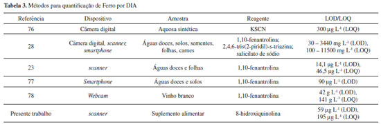 Ao comparar os limites do método proposto com outros já presentes na literatura para a determinação de ferro por DIA (Tabela 3), concluiu-se que os limites aqui apresentados são semelhantes ou melhores que os demais. Ressalta-se ainda que nenhum dos métodos já propostos empregaram a complexação com o ligante 8HQ ou a extração do analito para um suporte sólida, de modo a promover seu isolamento da matriz da amostra e pré-concentração.