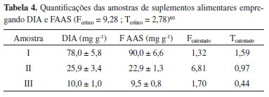 Aplicação do método e comparação com método de referência A exatidão do método proposto foi avaliada tanto pela realização de testes de recuperação quanto pela comparação estatística dos resultados obtidos para as quantificações com um método de referência de FAAS (Tabela 4). Todas as amostras foram avaliadas em triplicatas. De fato, os teores de ferro total determinados se encontraram em acordo com o que era proposto no rótulo dos suplementos.