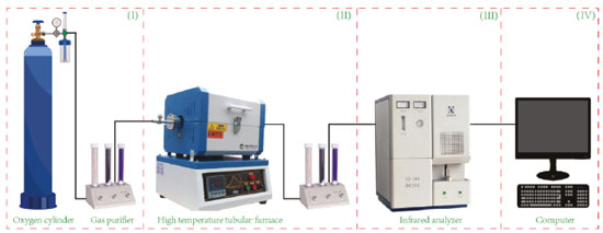 ![]() Figure 1. Schematic diagram of TPO-IR apparatus: I- gas supply system; II- high temperature oxidation system; III- infrared detection system; IV- data recording and control system
