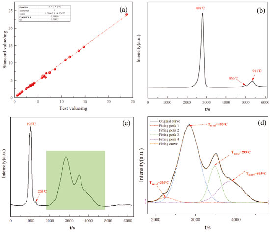 ![]() Figure 2. Calibration curve (a), TPO-IR curves of Ag2S (b), and original (c) and locally magnified (d) TPO-IR curves of FeS