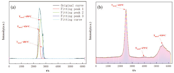 Figure 2(c) and 2(d) give the original and locally magnified TPO-IR curves of FeS, respectively. Due to the unstable structure of FeS, the oxidation and release of SO2 are more complex. In the presence of trace moisture in the air, FeS is gradually oxidized to ferric oxide and sulfur. The chemical equation is as follows: ![]() Therefore, the Tmax of 198 °C and 234 °C belong to the oxidation peak of elemental sulfur which is formed by oxidation of FeS in air. At higher temperatures, the TPO-IR curves of FeS can be deconvoluted into four individual curves, corresponding to the Tmax of 396 °C, 493 °C, 599 °C, and 665 °C, respectively. Therein the Tmax of 493 °C should be the characteristic temperature of sulfur specie in FeS and the remaining Tmax may be intermediate sulfides formed by oxidation of FeS. TPO-IR analysis of phosphorite The composition of phosphorite is complex, and the composition of each producing area is also different. In addition to the main components of Ca5(PO4)3F, SiO2 and dolomite, the phosphorite also contains a small amount of carbon and sulfur species. Figure 3(a) and (b) present the TPO-IR curves of phosphorite from Kaiyang and Weng'an. Three sulfur species were found in Kaiyang phosphorite by fitting the TPO-IR curves, corresponding Tmax of 426 °C, 450 °C, and 481 °C. According to the literature reports, the sulfur species with the Tmax of 426 °C may be pyrite sulfur, while the other two sulfur species with Tmax above 450 °C may be thiophene sulfur.33,34 For Weng'an phosphorite, there are at least three sulfur species, namely pyrite sulfur with Tmax of 432 °C, complex sulfide with Tmax of 679 °C and sulfate sulfur with Tmax of 939 °C.