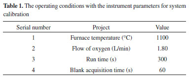 System calibration and operating conditions The qualitative and quantitative analysis of sulfur species is based on temperature programmed characteristic temperature method and constant temperature correction method, respectively. First of all, the calibration of quantitative analysis results is carried out at a fixed temperature of 1100 °C. Silver sulfide (Ag2S, purity ≥ 99.995%) was used as the calibration materials in this work. The Ag2S sample was ground (<100 µm) to reduce the effect of mass transfer. The standard samples with different mass (range of 10 mg-150 mg) were weighed accurately with a one hundred thousandth balance. Samples were stored in a ceramic boat which was calcined at 1300 °C for 8 h. The tube furnace was heated at a predetermined rate (typically 5-15 °C min-1) from room temperature to 1100 °C and finally fixed at 1100 °C for standard sample test. The standard samples were determined by constant temperature (1100 °C) with an oxygen flow of 1.80 L min-1. The operating conditions with the instrument parameters were listed in Table 1. These parameters were selected according to the characteristics of SO2 emission from oxidation of the selected standard samples under high temperature. Before the test, the blank oxygen signal was collected as the baseline under the test conditions. When the baseline signal is stably collected, the sample was pushed into the high temperature zone of the tubular furnace immediately, and the push rod was pulled out quickly to avoid damaging by high temperature. As the sample completely releases the sulfur signal, the data collection can be stopped and the next round of sample testing can be carried out. To prevent the formation of SO2 pollution environment, the tail gas is absorbed by sodium hydroxide solution. After analysis, the instrument should indicate the total sulfur mass.