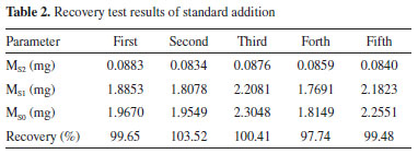 In addition, in order to assess the correctness of analyte addition to the matrix, recoveries of analyte spike were estimated by analyzing a set of Ag2S standards with SiO2 addition at a fixed temperature of 1100 °C. The value of the recovery of spike was calculated using the following equation: Recovery= (MS1-MS2)/MS0, where MS1 - measured value of S in Ag2S standards with SiO2 addition, MS2 - measured value of S in SiO2, MS0 - theoretical value of S in Ag2S standards. The obtained values of recovery of analyte addition are summarized in Table 2.
