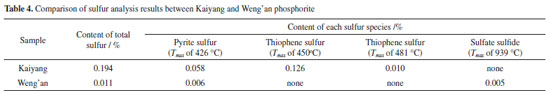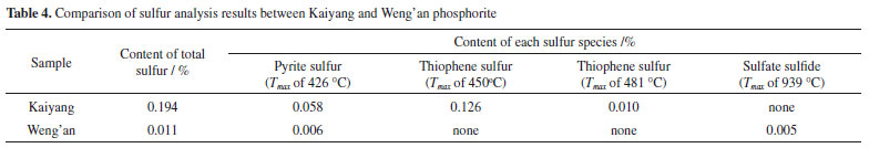 The content of sulfur species of phosphorite was calculated by fitting curves information and the results are summarized in Table 4. The total sulfur content of the two kinds of phosphorite is lower than 0.200%, of which Kaiyang phosphorite is 0.194% which is far higher than 0.011% of Weng'an phosphorite. From the point of view of sulfur species, the two kinds of phosphorite have pyrite sulfur, but the content of pyrite sulfur in Kaiyang phosphorite (0.058%) is much higher than that in Weng'an phosphorite (0.006%). The content of thiophene sulfur in Kaiyang phosphorite is up to 0.136%, while Weng'an phosphorite contains 0.005% of sulfate sulfur and no thiophene sulfur.