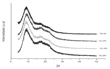![]() Figura 1. DRX de filmes de triacetato de celulose com 0%; 10%; 20% e 30% de glicerol