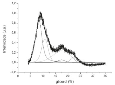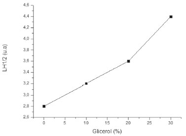 A Figura 3 apresenta a mudança da largura à meia altura (LH1/2) para o pico localizado em 2q = 17o no DRX em função da porcentagem de glicerol, após a deconvolução.