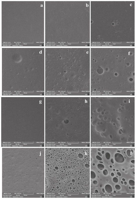 ![]() Figura 4. Imagens por MEV da superfície (500 x), superfície (5,00 kx), superfície (20kx) respectivamente das membranas TAC 0%, (a, b, c); TAC 10% (d, e, f); TAC 20% (g, h, i); TAC 30% (j, k, l)