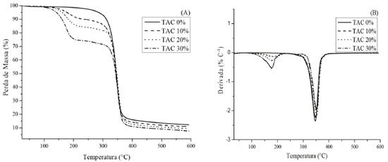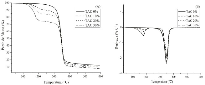 ![]() Figura 5. Curvas TGA (A) e DTG (B) para os filmes de TAC com e sem adição de glicerol. Taxa de aquecimento de 10 ºC min-1 e fluxo de N2 a 60 cm3 min-1