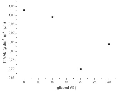Na Figura 6 estão representados os valores de TTVAE (Taxa de Transporte de Vapor d'Água Específica) em função do teor de glicerol.