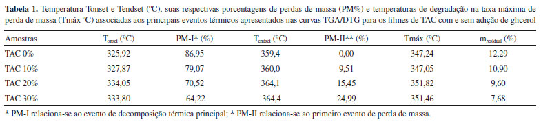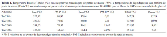 A partir dos resultados obtidos na Figura 5 e apresentados na Tabela 1, nota-se que a adição do glicerol não conferiu mudanças significativas nas Tonset e Tendset do evento principal associado à decomposição das cadeias celulósicas do TAC, ou seja, não afetou a estabilidade térmica do polímero. Essa hipótese é reafirmada pelos valores de Tmáx (temperatura de degradação na taxa máxima de perda de massa) que também se mantém com valores próximos para todos os filmes produzidos. É importante destacar a presença de um primeiro evento, na Figura 5B, com Tmáx de 182,03 °C, 178,66 °C e 177,27 °C para os filmes TAC 10%, TAC 20% e TAC 30% que, por suas temperaturas próximas e % de perda de massa (vistas na Figura 5A entre 150 e 200 °C) próximas às quantidades de glicerol adicionadas a cada filme, pode estar relacionado à decomposição térmica do glicerol. Taxa de transporte de vapor d'água (TTVA) e permeabilidade ao vapor d'água (PVA) Na Tabela 2 estão apresentados os dados de TTVA e PVA para os filmes de triacetato de celulose com e sem glicerol.