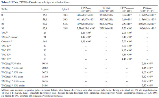 Efeito do teor de glicerol no transporte de vapor d'água através de filmes de triacetato de celulose produzidos a partir do aproveitamento da palha de milho (zea mays L.) Effect of glycerol content on water vapor transport through cellulose triacetate films produced from the use of corn (zea mays L.) straw |