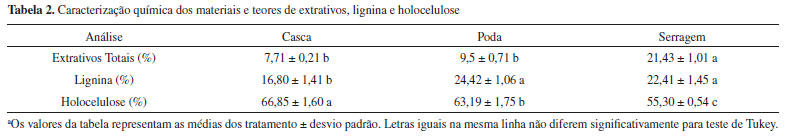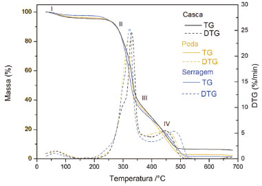 Observa-se na Tabela 2 que a serragem obteve o maior teor de extrativos totais (21,43%), a casca (7,71%) e a poda (9,5%) não diferiram estatisticamente entre si. Segundo Teixeira et al.,42 os teores de extrativos das matérias-primas provenientes de resíduos de Eucalyptus sp. variam de 12 a 15%. Para Moulin et al.,43 os teores variaram de 2,12% a 5,64%, para urograndis. O elevado teor de extrativos apresentado na serragem (21,43%), pode ser justificado pela presença do adesivo (cola) e revestimentos melamínicos utilizados na fabricação dos painéis. A casca de eucalipto apresentou o teor de lignina de 16,8%, sendo estatisticamente menor do que o obtido para a serragem (24,42%) e a poda urbana (22,41%). De acordo com Neiva et al.,35 a casca apresenta teor de lignina inferior ao da madeira, explicando a diferença entre os resultados encontrados para a casca e a serragem de madeira. No presente estudo, os valores de lignina encontrados para casca e a serragem aproximaram-se aos da literatura para resíduos provenientes de urograndis. O teor de lignina encontrado por Xiao et al.44 foi de 15,6% para casca. Morais et al.45 obtiveram 23,25% de lignina para serragem. Os teores de holocelulose das biomassas casca (66,85%), poda (63,19%) e serragem (55,30%) foram inferiores aos encontrados na literatura: poda de laranjeira (73,20%),46 casca de urograndis (74,81%)47 e serragem de urograndis (86,25%).45 Os valores encontrados para a holeocelulose é resultado da heterogeneidade dos materiais: casca (impurezas, principalmente sílica), poda (diversas espécies e diferentes partes, incluindo folhas) e serragem (presença de adesivo, revestimento dos painéis). Essas impurezas (sílica, folhas, adesivo, revestimentos) iterferem nas análises de lignina e extrativos. Análise Termogravimétrica (TGA) A Figura 1 evidencia as curvas termogravimétricas (TG) e as derivadas das curvas termogravimétricas (DTG), em função da temperatura das biomassas casca de eucalipto, poda urbana e serragem, respectivamente.
