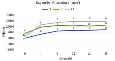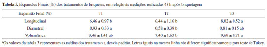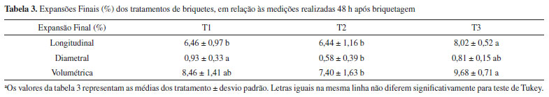 As curvas da Figura 2 mostram que a expansão volumétrica ocorreu nas quatro primeiras horas. Para todos os tratamentos os briquetes apresentaram uma estabilidade dimensional 4 h após a prensagem. A Tabela 3 apresenta os valores médios finais de expansão longitudinal, diametral e volumétrica, 48 h após briquetagem dos tratamentos T1, T2 e T3.