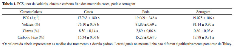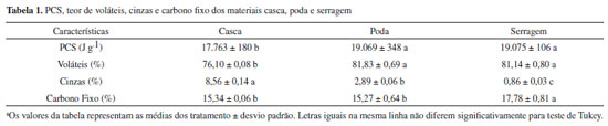 RESULTADOS E DISCUSSÃO Determinação de umidade Os materiais, nas condições em que se encontravam no pátio da indústria, apresentaram as seguintes umidades na base seca: Casca - 97%, Poda - 60% e Serragem - 8%. Na indústria, para a produção de energia, a umidade é uma das variáveis mais importantes, sendo ideal que os materiais apresentem até 35%.28 A umidade >15% causa perdas no aproveitamento energético, visto que o poder calorífico diminui com o aumento da umidade no material. Ainda, pode diminuir a resistência mecânica (compressão diametral) e diminuir a resistência ao tamboramento (maior índice de quebra dos briquetes).29,30 Para a produção de briquetes, as umidades de biomassa de eucalipto que proporcionam melhores propriedades mecânicas estão entre 10 e 12%.31 A casca e a poda urbana apresentaram umidades consideradas elevadas, devido ao sistema de armazenamento destes resíduos, que é realizado sob forma de pilhas (pequenos montes) a céu aberto. Assim, a umidade fica retida no interior das pilhas,28 dificultando a secagem natural (ao ar livre) desses materiais. A secagem forçada (estufa, silos) pode ser uma alternativa, mas reflete em altos custos com equipamentos e energia. A serragem, por sua vez, possuiu umidade baixa por se tratar de um resíduo proveniente de processo industrial de produção dos painéis (200 ºC na prensagem), ou seja, um material seco (armazenado em silos). As análises mostraram que a umidade está fora dos níveis considerado ideal e apresentou heterogeneidade entre os materiais. Como resultado, há uma perda de eficiência e uma maior dificuldade de manter a estabilidade de operação da caldeira.32 Desse modo, para prosseguir com as demais análises do trabalho, foi necessária a secagem em estufa das biomassas casca e poda urbana. Caracterização química A Tabela 1 apresenta os resultados do PCS e da análise imediata (voláteis, cinzas e carbono fixo) das biomassas estudadas.