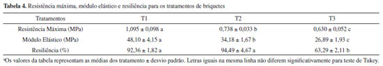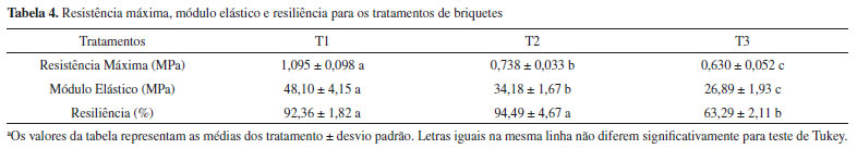 Na medição final, os tratamentos T1, T2 e T3 apresentaram respectivamente expansão volumétrica média de 8,46%, 7,40% e 9,68%, em relação aos volumes iniciais. Estatisticamente, T3 registrou as maiores expansões longitudinal e volumétrica, indicando instabilidade dimensional dos briquetes. Segunda Silva et al.,26 após a prensagem há uma tendência de expansão nos briquetes, que varia em função do tipo de biomassa, granulometria, umidade e condições do ambiente de armazenamento. Nesse estudo, o acondicionamento dos briquetes foi realizado em condições de temperatura e umidade relativa próximas ao ambiente da indústria. Uma forma de controlar a expansão é com o uso de aglutinantes na produção dos briquetes. Entretanto, aplicação de aglutinantes significa mudanças no processo e aumento nos custos de produção. A expansão dos briquetes é indesejável, pois vai interferir negativamente nas propriedades mecânicas. Os briquetes com maior expansão (menor estabilidade dimensional) apresentarão menor resistência mecânica.19 A Tabela 4 apresenta os resultados dos ensaios mecânicos: resistência máxima, módulo elástico e resiliência; realizados para os tratamentos de briquetes T1, T2 e T3.
