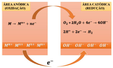 ![]() Figura 1. Esquemática das reações típicas de corrosão em uma interface metal-água