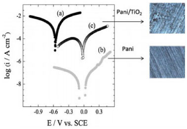 ![]() Figura 3. Curvas de polarização eletroquímica dos revestimentos de PAni-1 e PAni / n-TiO2 em comparação com o aço descoberto22