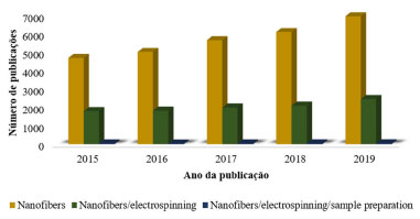 ![]() Figura 1. Representação esquemática do número de publicações por ano sobre nanofibras, nanofibras eletrofiadas e nanofibras eletrofiadas para preparo de amostras, nos anos de 2015 a 2019. Dados da Web of Science