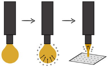 O processo consiste basicamente de três etapas sequenciais, a primeira de formação do fluxo da solução precursora, a segunda do alongamento dos fios e a terceira da solidificação da fibra. Desta forma, inicialmente ocorre a formação da gota de solução precursora na ponta da fieira (ou da agulha) seguida do seu carregamento eletrostático, sendo a etapa inicial deste carregamento marcada pelo balanço entre as forças de natureza eletrostática (atrativa em relação ao coletor) e a tensão superficial da solução (repulsiva em relação ao coletor).4 Subsequentemente, devido ao aumento da intensidade crítica do campo elétrico, até o seu valor crítico, as forças eletrostáticas superficiais da gota superam a tensão superficial que a sustenta, resultando na ejeção forçada do jato de solução do polímero precursor, no formato alongado e distorcido, denominado Cone de Taylor, conforme apresentado na Figura 3. Por fim, ocorre a volatilização do solvente em contato com a atmosfera ambiente, de forma que o material sólido é depositado sob o coletor.17-19