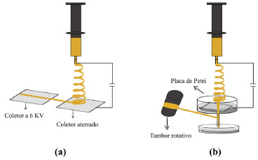 ![]() Figura 4. Esquema representativo de configurações de coleta de nanofibras. Em: (a) sistema de coletores paralelos e (b) sistema de coleta com tambor rotativo