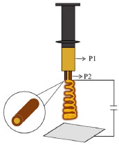 ![]() Figura 5. Esquema representativo do sistema de eletrofiação coaxial para produção de nanofibras core-shell
