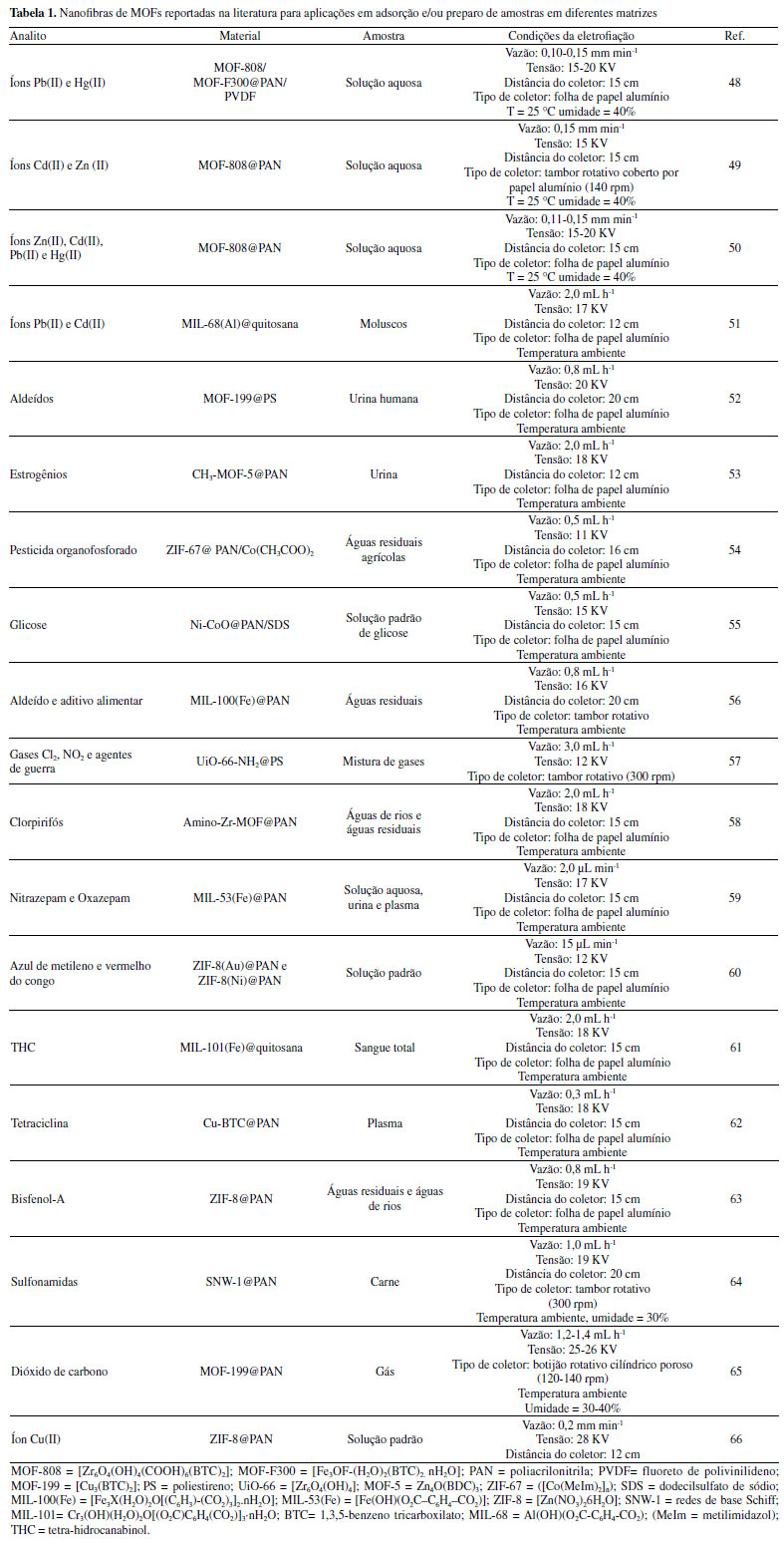Consensualmente, a presença dos ligantes orgânicos, em geral ácidos aromáticos, atribuem a existência de uma cavidade hidrofóbica, de alta afinidade para compostos orgânicos apolares ou de baixa polaridade, além da possibilidade do estabelecimento de interações intermoleculares do tipo ligação de hidrogênio, empilhamento π-π, dipolo-dipolo e interação eletrostática, permitindo maior eficiência como sorvente em comparação com outros materiais já conhecidos. Contudo, as maiores limitações desses materiais no que tange ao uso como extrator, se referem à baixa estabilidade química em meio aquoso e básico, além da dessorção incompleta ou irreversível dos analitos, devido à forte interação MOF-analito.46,47 A Tabela 1 apresenta os principais trabalhos relatados nos últimos anos visando o desenvolvimento e utilização de nanofibras poliméricas incorporadas com MOFs para aplicações em preparo de amostras/adsorção.