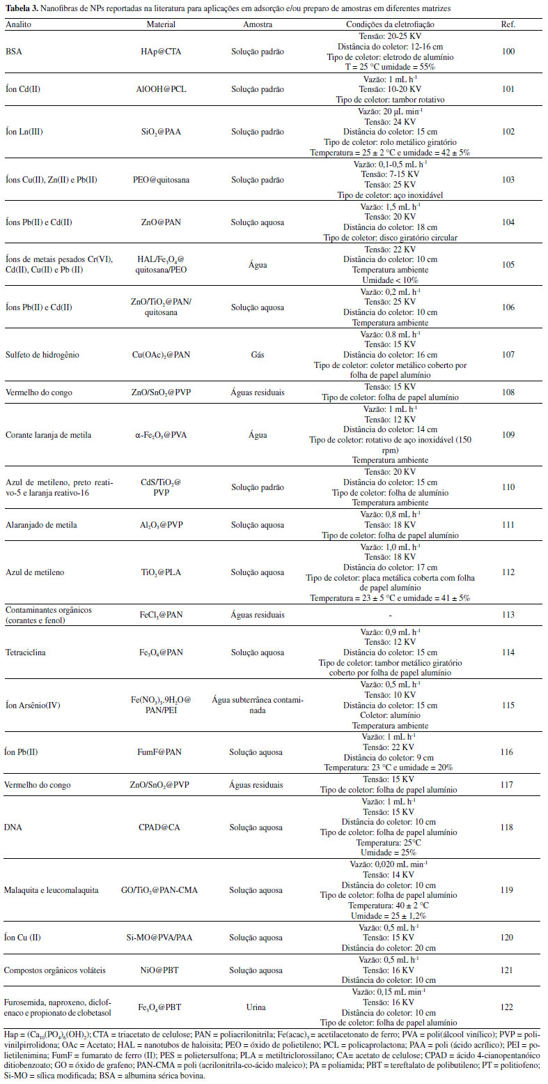 Dentre inúmeras nanofibras enriquecidas com NPs que foram descritas na literatura para diversas aplicações, pode-se destacar nanofibras aplicadas para a determinação de íons Pb(II), Cd(II), Cr(VI), Cu(II), Ln(III), As(IV) e Zn(II). Trabalhos como o de Hota e col., Wang e col. e Shariful e col. descreveram o desenvolvimento de materiais poliméricos enriquecidos com NPs para extração dos íons em solução padrão.101-103 Em 2018, Haddad e Alharbi relataram um aumento nas capacidades de adsorção dos íons Pb(II) e Cd(II) de soluções aquosas utilizando nanofibras de poliacrilonitrila enriquecidas com ZnO.104 No mesmo ano, Li e col. relataram o desenvolvimento de fibras compostas por óxido de polietileno/quitosana, enriquecidas com nanotubos de haloisita e óxido de ferro (Al2Si2O5(OH)4)/Fe3O4), cujos materiais apresentaram grande área de superfície específica e propriedades superparamagnéticas com alta eficiência para extração de metais pesados em água.105 Recentemente, Alharbi e col. desenvolveram membranas de nanofibras funcionalizadas com óxidos metálicos para adsorção de Pb(II) e Cd(II). Em estudos de adsorção, os autores demonstraram após a otimização parâmetros como pH da solução, concentrações iniciais de íons e tempo de interação, recuperações próximas de 100% para ambos os íons.106 Trabalhando com amostras gasosas, Bajaj e col. desenvolveram nanofibras de carbono ativado enriquecido com NPs de óxido de cobre para adsorção de sulfeto de hidrogênio. O material foi sintetizado, caracterizado e aplicado em testes de adsorção. Os autores relataram que o material funcionalizado exibiu um aumento significativo na capacidade de adsorção quando comparado com o suporte polimérico puro.107 Para purificação de águas residuais, Chen e col. estudaram nanofibras de polivinilpirrolidona enriquecidas com ZnO/SnO2, aplicadas para fotodegradação do corante vermelho do congo. Os autores relataram que capacidade de fotodegradação do corante pelo material pode ser atribuída à alta capacidade de adsorção, proveniente da forte interação eletrostática entre as NPs incorporadas e o corante vermelho do Congo.108 Nesse mesmo sentido, Gao e col., Pant e col., Shen e col. e Zhou e col. sintetizaram nanofibras visando a adsorção de corantes em água. Gao e col. produziram nanofibras de PVA incorporadas com NPs de α-Fe2O3, com eficiente adsorção de laranja de metila, Pant e col. relataram o estudo de nanofibras de PVP incorporadas com NPs de CdS/TiO2 suportadas em nanofibras de carbono para alta eficiência de adsorção e decomposição simultânea de azul de metileno, preto reativo 5 e laranja reativo 16.109,110 Já Shen e col. trabalharam com nanofibras de PVP enriquecidas com alumina mesoporosa para aplicação na adsorção do corante laranja de metila. O material apresentou um bom desempenho na adsorção do corante, além de estrutura altamente estável e boa reutilização.111 Zhou e col. desenvolveram membrana nanofibrosas de PVA revestida com TiO2 para separação de óleo/água e adsorção de azul de metileno. Os autores obtiveram alto fluxo de permeação e boa eficiência de filtração ideal.112 Demirci e col. tiveram por objetivo a adsorção de DNA através da modificação de nanofibras de acetato de celulose. Após sintetizado e caracterizado, foram feitos estudos de adsorção e reutilização do material, cujos resultados sugeriram o potencial das nanofibras para aplicações biotecnológicas.118 Bagheri e col. também sintetizaram nanocompósito eletrofiados incorporados com Fe3O4 para extração sob campo magnético de furosemida, naproxeno, diclofenaco e propionato de clobetasol. O método foi validado visando a determinação dos fármacos selecionados em amostras de urina e os resultados indicaram que este método tem potencial suficiente para enriquecimento e determinação dos analitos na amostra de urina obtendo recuperação na faixa de 78-91%.122