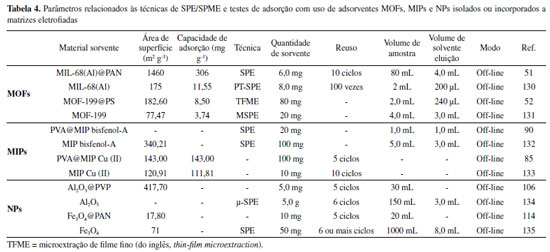 NANOFIBRAS ENRIQUECIDAS VS MIP/MOF/NP ISOLADOS: COMPARAÇÃO DE DESEMPENHO E CONFIGURAÇÕES DE USO Conforme já descrito, a eletrofiação permite produzir fibras unidimensionais (ex.: fios únicos), bidimensionais (ex.: folhas e filmes finos) e tridimensionais (ex.: nanoestruturas), atribuindo inúmeras possibilidades de configurações de fibras únicas ou arranjos de múltiplas fibras, em diversos formatos e configurações existentes de SPE e SPME, embora diferentes disposições das fibras levem a efeitos significativos no desempenho dos dispositivos analíticos.1,38 Notadamente, a maior parte dos trabalhos que tratam da utilização de nanofibras em dispositivos SPE/SPME, reportam aplicações de múltiplas fibras nos formatos de discos,123,124 membranas125 e microcolunas126,127 no modo off-line. Contudo, limitações relacionadas a reprodutibilidade do preparo desses dispositivos têm sido relatadas na literatura. Em contrapartida, alguns autores sugerem que utilização de peças únicas na extração direta por SPME, seja por imersão direta da fibra na matriz ou por headspace, facilitam a difusão do analito para a fibra e propicia melhores recuperações e reprodutibilidade,128,129 embora essa estratégia seja menos recorrente. Alternativamente, o desenvolvimento dos materiais enriquecidos também é apontado como uma estratégia eficiente, afim de reduzir os problemas relativos ao empacotamento e melhorar o desempenho analítico. 1,38 A Tabela 4 apresenta parâmetros relacionados às técnicas de SPE/SPME e testes de adsorção com uso de adsorventes MOFs, MIPs e NPs incorporados a matrizes eletrofiadas e isolados, como forma de comparação do desempenho desses materiais.