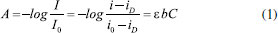 RESULTS AND DISCUSSION Absorbance measurements Step 1. Picking the most suitable LED The Beer-Lambert law states that the absorbance (A) has a linear relation with the analyte concentration and can be indirectly obtained from measuring the light intensities before (I0) and after (I) passing through the absorbing medium (b) (i.e. optical pathlength). If light intensities are measured with photodiodes operating in the photocurrent mode absorbance can be obtained from using current after (i0) and before (i) interaction with the absorbing medium (where iD is the dark current). The relation is equally true to the Voltage instead of the current if using a current-to-voltage converter. Equation 1 shows the described relation. ![]() where: ε = molar absorptivity coefficient. Strictly speaking, Beer-Lambert law is theoretically true only for monochromatic radiation. However, even a commercial spectrophotometer does not provide monochromatic light, as it has 2-10 nm bandwidth. Broader bandwidth may lead to spectral distortion. LEDs have a typical FWHM of 10-30 nm and therefore can be considered a non-monochromatic radiation source. In such a case, the Lambert-Beer law is modified by taking account of the variation of the intensity of the light source (I0), the sensitivity of the detector (S), and the molar absorptivity across (ε) the band of the light source, according to the equation 2.6 ![]() Therefore, the broad behavior of the emission spectra of LED can lead to non-linear calibration curves and also results in high limits of detection (LODs). In practical terms, the deviation of linearity is higher when the absorbance bands of the analyte are not well matched with the LED emission spectra. Therefore, picking the right LED - which means matching the peak emission wavelength of LED to the analyte absorption maximum - is the most crucial part to achieve suitable linearity and low LODs. Figure 3 describes good and poor examples of LED selection for the development of an analytical method based on absorbance measurements.