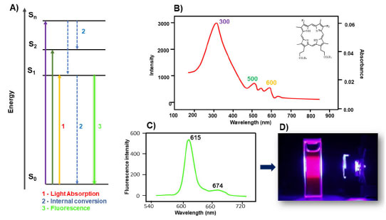![]() Figure 1. Jablonski diagram (a), Absorption spectrum of the Photogem molecule (b), Emission spectrum of the Photogem molecule (c), Photogem solution under UV light (d)