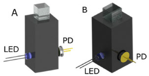 ![]() Figure 2. CAD drawing representation of the 3D printed device for (a) absorbance measurements and (b) fluorescence measurements using a LED/PD based device