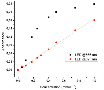 As can be demonstrated by table 2, the analytical performance of the LED-based photometer is similar to a conventional spectrophotometer in terms of sensitivity and linearity. The spectrophotometer has a Si-photodiode as a detector element. It is important to note that the circuitry was assembled on a breadboard with exposed wires, which certainly increased the noise effect. For precise measurements, the circuitry must be mounted using a grounded box (if made of metal) containing the printed circuit board (PCB) and the wires. Also, the suitable linearity of the LED-based device was obtained due to the match between the LED emitting band and the absorption band of the analyte. (b) Comparing the analytical performance of two LEDs In some cases, there is no exact match between one light-emitting diode spectra with the absorption band of the analyte. For instance, the absorbance spectra of the red complex nickel (II) dimethylglioximate (max absorption at 540 nm) does not match exactly with any available LED, and rather two possibilities are available with maximum emission at 525 or 565 nm. In this scenario, the linearity of each measurement must be evaluated to obtain the best performance. Here, we have prepared solutions of different concentrations of nickel (II) dimethylglioximate and it was obtained analytical curves for absorbance measurements for each LED for comparison purposes. As can be seen in Figure 5, the more suitable LED for this example is the one emitting at 525 nm.