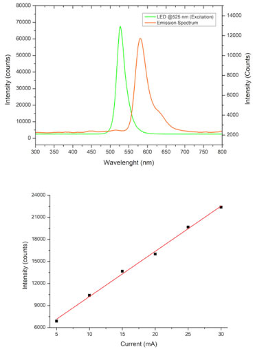 ![]() Figure 6.(a) Emission spectrum of Rhodamine B when excited with a LED @ 525 nm (green line) and (b) influence of the LED driven current in the fluorescence intensity. Rhodamine concentration: 5 μmol L-1