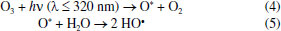 O PODER OXIDANTE DO OZÔNIO EM MEIO AQUOSO O ozônio é moderadamente solúvel em água (12 mg dm-3; 25 ºC), além de formar uma solução pouco estável na sua forma dissolvida. Parte dele é perdido por evaporação e outra parte por reações em cadeia com moléculas de água. Inicialmente, o ozônio reage com os íons OH- da água para formar os radicais HO2 e O2- (equação 7), que subsequentemente participam de uma série de reações radicalares em cadeia. O radical hidroxila (HO) e as moléculas de ozônio dissolvidas são as principais espécies envolvidas em diferentes reações de oxidação da matéria orgânica presente no meio aquoso.34 ![]() Além da geração de um poderoso oxidante (HO), o ozônio solúvel na água reage com compostos aromáticos e alifáticos insaturados, polissacarídeos, álcoois, ácidos graxos insaturados, nucleobases e também pode reagir com H2O2, Fe3+, HO- e/ou radiação UV, dando início aos processos de oxidação avançados (POA), que são amplamente empregados na degradação da matéria orgânica.35 Inúmeros trabalhos descrevem os processos que ocorrem na solubilização do ozônio na água e suas reações diretas e indiretas. Portanto, a qualidade da água, bem como a presença de íons metálicos, substâncias orgânicas e o pH devem ser rigorosamente controlados; caso contrário, uma grande quantidade de produtos indesejáveis pode estar presente no meio.