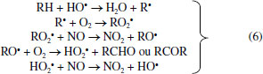 OZÔNIO NA TROPOSFERA Diversos oxidantes podem ser encontrados no ar ambiente, sendo os principais: O3, H2O2, HO, HO2, NO3 e nitrato de peroxiacetil (PAN). O O3 está envolvido diretamente ou indiretamente em diversas cadeias de oxidação primárias que ocorrem na atmosfera para formação desses oxidantes.9 A geração do ozônio na troposfera ocorre através da interação de NO2 com a radiação eletromagnética (entre 295 e 430 nm), formando óxido nítrico (NO) e oxigênio atômico (O), que ao reagir com oxigênio molecular (O2) produz O3, conforme equações (1) e (2), em que M é uma molécula que absorve o excesso de energia (geralmente N2 ou O2).24,25 ![]() Em atmosferas limpas, o NO2 é formado por meio da reação de oxidação do NO pelo O3, de modo que sua fotodecomposição (equação 1), a formação do O3 (equação 2) e seu posterior consumo, através da reação com NO (equação 3), resultam em um estado estacionário.26,27 ![]() O aumento na concentração de O3 na troposfera deve-se à presença de quantidades significativas de NOx e COVs, os quais são emitidos a partir de fontes antrópicas diversas e também são liberados de forma natural pela vegetação. Esses compostos competem com o ozônio na oxidação do NO para formação do NO2.28 Como resultado, o equilíbrio fotoestacionário é quebrado e a concentração do ozônio aumenta, principalmente quando a relação entre COVs/NOx tende a excessos de COVs.29 O O3 formado promove diversas cadeias de reações atmosféricas. A principal reação é iniciada pela fotólise do ozônio em presença de vapor d'água, gerando radicais hidroxil (equação 5).24,28 ![]() A contribuição dos radicais HO na oxidação dos COVs, que resulta na conversão do NO a NO2 e, consequentemente, no incremento na concentração de O3, pode ser descrita em um modelo simplificado na sequência de reações radicalares (equação 6). ![]() Os COVs (RH) entram na cadeia de oxidação pela reação com os radicais HO, iniciadores das reações que, posteriormente, resultam na formação do O3. Os radicais orgânicos formados (R) geram radicais peróxi (RO2 e HO2), os quais são responsáveis pela oxidação do NO a NO2. Concentrações altas de COVs resultam na maior produção de O3 na troposfera, pois os radicais peróxi formados atuam como oxidantes de NO, aumentando, desta forma, a concentração da molécula precursora de O3 na troposfera (NO2) e minimizando a principal via de eliminação do ozônio formado (equação 3), que envolve a conversão do NO a NO2.9 O aumento do ozônio na troposfera é consequência dessas reações e produto da emissão indiscriminada de COVs e NO por atividades antrópicas. Estudos sobre o ozônio troposférico relatam que aos fins de semana, devido ao menor fluxo de veículos movidos a diesel (reconhecido emissor de NOx), ocorre um aumento nas concentrações de O3, o que mostra o papel importante do NO no consumo de ozônio e formação do NO2.29-31 Intrusões estratosféricas de ozônio na troposfera também são bem documentadas na literatura, podendo atingir o solo, elevando substancialmente a sua concentração no ambiente.32,33 O resultado é que os padrões de qualidade do ar podem ser ultrapassados em um curto intervalo de tempo. Esses fenômenos não são difíceis de acontecer e são mais frequentes em locais de altitude elevada.33