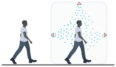 ![]() Figura 2.Representação do sistema em formato de túnel para desinfecção de humanos usando névoa contendo desinfetantes como o ozônio. (Created with BioRender.com)