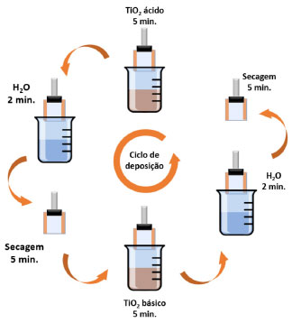 ![]() Figura 1. Esquema dos ciclos de deposição em diferentes soluções para a formação dos filmes de TiO2
