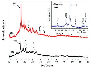 ![]() Figura 1. Difratogramas de raios X dos materiais (A) Magnetita, (B) Pani e (C) Pani-Mag