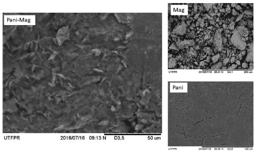 ![]() Figura 2. Imagens de Mev dos materiais Magnetita, Pani e Pani-Mag