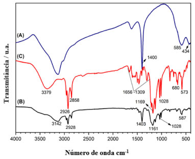 ![]() Figura 3.Espectro de Infravermelho para (A) Magnetita, (B) Pani e (C) Pani-Mag