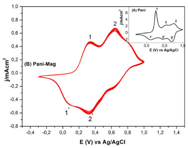 A presenca do óxido no compósito Pani-Mag se mostrou mais sensível, mais estável eletroquimicamente e com melhores respostas eletroquímicas ao se comparar com eletrodo modificado apenas com Pani. Vale ressaltar que satisfaz aos objetivos, pois a intenção era qualificação do material eletroativo. Esse resultado mostra que o compósito Pani-Mag é promissor para aplicação como sensor de AA. Testes analíticos de limites de detecção e quantificação serão realizados para determinar esses parâmetros em trabalhos futuros. No entanto, pela resposta obtida no teste de voltametria, observou-se que há resposta para sensor de detecção do analito ácido ascórbico em solução, sendo essa uma aplicação de interesse biológico e tecnológico.