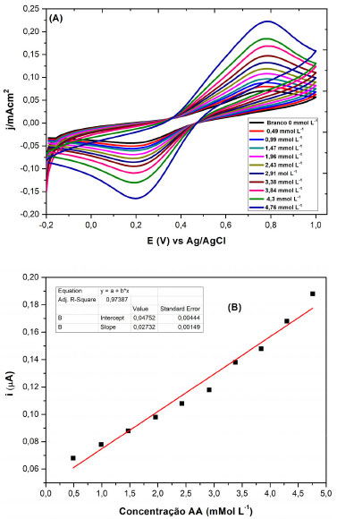 Já o conjunto de picos em 3 e 3' correspondem a efeitos de degradação do polímero e formação de intermediários como quinonas e hidroquinonas, quebra de ligações da cadeia polimérica e formação de ligações intercadeias na etapa de síntese. Esses intermediários são indesejados, visando-se a uma aplicação em sensores, pois indicam que não houve estabilidade nos processos redox.16,29 No voltamograma do compósito Pani-Mag, observam-se dois conjuntos de oxidação/redução, 1 (em 0,33 V) e 2 (em 0,65 V) e o segundo, 2' (em 0,31 V) e 1' (em 0,09 V), respectivamente, sugerindo a presença de Pani na forma condutora, uma vez que são atribuídos às transições características dessa fase. Observa-se melhor estabilidade de ciclagens pelas intensidades da densidade de corrente que foi menor em relação à Pani, e pelo fato de não aparecerem picos intermediários de degradação, que são atribuídos ao sinergismo entre as partículas magnéticas e o polímero. Os resultados apresentados mostram que o compósito sintetizado tem as fases polimérica e partículas magnéticas em sinergismo, contribuindo para melhorar as propriedades eletroquímicas da Pani, mantendo as propriedades magnéticas da magnetita, conforme as análises de magnetização. As características apresentadas são importantes em um sensor eletroquímico, que deve ter resposta de análise rápida, estabilidade eletroquímica, fácil manuseio e preparo do eletrodo de trabalho. Além disso, o compósito tem possibilidade de melhorar o desempenho do eletrodo como sensor. Através da transferência de elétrons por oxidação e redução, melhora a área superficial e reduz a possibilidade de contaminações do eletrodo.30 Considerando que a estabilidade observada pela boa interação entre as fases e que as características magnéticas e eletroquímicas da Pani foram melhoradas devido à presença da magnetita, foi proposto utilizar este material como um sensor eletroquímico de ácido ascórbico. Não foi encontrada na literatura a aplicação de material semelhante para essa finalidade, apenas exemplos com eletrodo modificado de pasta de carbono com magnetita13 e eletrodo modificado com Carbono e Nafion.12 Estudos preliminares aqui apresentados apontam para um sistema promissor. Para evidenciar o potencial de aplicabilidade do compósito, realizaram-se testes eletroquímicos para sensores, que determinassem o perfil de oxidação do ácido ascórbico, à medida que sua concentração aumentava na cela eletroquímica. Testes foram realizados utilizando-se o compósito Pani-Mag em suspensão gotejados na superfície do eletrodo de trabalho, obtendo-se como melhores condições em solução tampão de fosfato de potássio 0,1 mol L-1 em pH 4,0 e intervalo de potencial de -0,2 a 1,0 V e escala de corrente de 1 μA e velocidade de varredura de 50 mV s-1. Solução padrão de AA na concentração de 0,1 mol L-1 foi adicionada em 10 alíquotas sucessivas de 100 μL cada, com posterior leitura do voltamograma cíclico a fim de acompanhar o perfil de oxidação, em função da concentração do analito que vai aumentando na célula eletroquímica. Um branco foi realizado apenas com o eletrodo modificado na superficie do eletrodo, sem adição de alíquotas de AA em solução, em que houve estabilização no perfil após ciclagens. Somente após adicionar o analito que gradativamente foi modificando o perfil eletroquímico, conforme descrito na figura a seguir. Na Figura 7, em (A) observa-se o comportamento redox do AA, sendo que conforme aumenta a concentração do analito, aumenta a corrente de pico, evidenciado em (B). Esse aumento da corrente é devido à taxa de transferência de elétrons na superfície do eletrodo de carbono vítreo que se encontra modificada com o compósito Pani-Mag.12 Na faixa de potencial de trabalho é o único conjunto redox detectado.